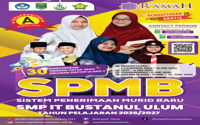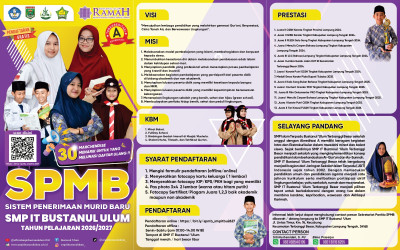 SPMB SMP IT Bustanul Ulum Terbanggi Besar, Tahun Pelajaran 2026/2027 telah dibuka,. silahkan daftarkan Putra/Putri anda sekarang juga, mari bergabung bersama kami ...